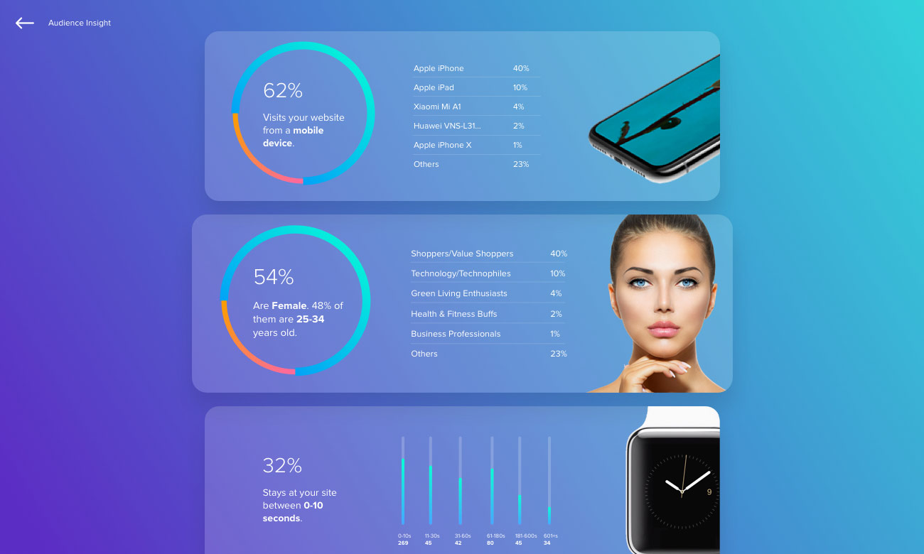 We turn your analytics data into insights. We don't just present data in a nicer, easier to read format, but also provide useful insights for your business. Our monthly and per-campaign reports include in-depth details of your targeted audience on social media and mobile marketing platforms. Click HERE to download a sample report.